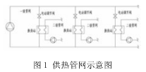 城市供熱管網(wǎng)系統(tǒng)是由多個串并聯(lián)管段組成的管路系統(tǒng),是城市集中供熱系統(tǒng)的重要組成部分。為滿足各熱用戶個性化供暖需求,實現(xiàn)系統(tǒng)的節(jié)能降耗,分戶計量控制供暖系統(tǒng)形式正在逐步推廣。由于采暖用戶的自主調(diào)節(jié),連接系統(tǒng)一、二級管網(wǎng)的換熱站應(yīng)隨著用戶末端進行調(diào)節(jié)。首先是在二級管網(wǎng)側(cè)通過循環(huán)水泵的變頻,來保證二級管網(wǎng)某處的供、回水壓差不變,目的是穩(wěn)定因末端用戶用熱的改變而對管網(wǎng)水力工況的影響,然后,改變一級管網(wǎng)側(cè)的供熱參數(shù)來確保二級管網(wǎng)側(cè)的供水溫度、及供回水溫差的穩(wěn)定。在這一過程中,一級管網(wǎng)側(cè)實際上是按照二級管網(wǎng)側(cè)所需的供熱量在進行被動調(diào)節(jié)。然而,管網(wǎng)系統(tǒng)中各管路水力工況相互影響,系統(tǒng)中任何一個調(diào)節(jié)裝置的工作參數(shù)發(fā)生改變,必然會引起各熱用戶(換熱站)之間流量的重新分配。當(dāng)各換熱站一級管網(wǎng)側(cè)均因二級管網(wǎng)側(cè)負荷的改變而各自進行被動調(diào)節(jié)時,由于各換熱站管路間水力工況相互影響,就必然會導(dǎo)致系統(tǒng)水力、熱力失調(diào),影響供熱效果。因此,為了提高供熱管網(wǎng)整體的運行調(diào)節(jié)與控制水平,減小水力、熱力失調(diào),保證供熱穩(wěn)定性,必須將換熱站一級管網(wǎng)各自的被動調(diào)節(jié)進行統(tǒng)一管理和控制。