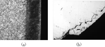 分別在調(diào)節(jié)閥桿端面上制備金相樣品,金相組織如圖3(a)、(b)所示。在金相樣品的邊緣觀察到氮化層,氮化層深為0。25~0。38mm,在氮化層邊緣及內(nèi)部有許多微小的顯微裂紋,對調(diào)節(jié)閥桿的螺紋處進行腐蝕,發(fā)現(xiàn)螺紋處局部有氮化的痕跡,且被氮化的螺紋處大都有螺紋剝落發(fā)生,調(diào)節(jié)閥桿金相樣品的晶粒度都為4級,金相組織為回火索氏體。