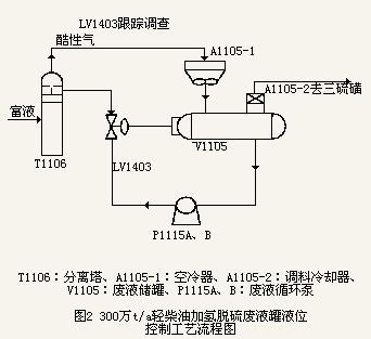 新型陶瓷內(nèi)件調(diào)節(jié)閥于2001年11月在某煉油廠300萬t/a輕柴油加氫脫硫廢液罐液位控制系統(tǒng)中應(yīng)用(圖2),系統(tǒng)正常運(yùn)行至今,表明新型閥門經(jīng)受住該處流體的強(qiáng)腐蝕作用,確保了生產(chǎn)的正常安全運(yùn)行,并節(jié)約了大量維修更新閥門的費(fèi)用。