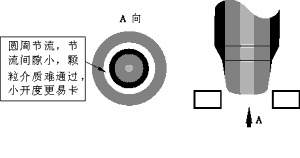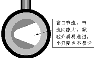 | 介質(zhì)流經(jīng)節(jié)流口時(shí),在同樣的節(jié)流面積條件下,如果節(jié)流間隙小,不干凈介質(zhì)不易通過, 容易堵塞;反之,則不易堵塞。對(duì)柱塞型閥芯(見圖六),它的節(jié)流面積分布在圓周上, 其節(jié)流間隙大概等于面積除以圓周長(zhǎng);再看窗口型閥芯(見圖七),其面積分布在窗口上 而不是在整個(gè)圓周上,所以其間隙大,顆粒很容易通過。由此可見,節(jié)流面積越集中(不是圓周分布),節(jié)流間隙越大,防堵性能就越好。這樣的典型產(chǎn)品有“V”型球閥、全功能超輕型調(diào)節(jié)閥等。尤其在小開度工作時(shí),前者的節(jié)流間隙更小,更易堵卡;后者集中在“V”形口的尖端部份,面積集中,充分顯示了“V”形節(jié)流的防堵優(yōu)勢(shì)。 | ||||||