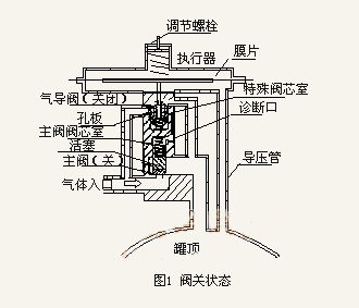 如圖1所示,當?shù)忾y關(guān)閉時,主閥的活塞是在一個密封室內(nèi),當儲罐壓力等于或大于設(shè)定的壓力時,膜片就被向上頂起,氣導(dǎo)閥在彈簧的作用下向上移動,把氣導(dǎo)閥上的密封圈緊緊壓在閥座上,關(guān)閉了控制氣的進口,同時特殊閥芯室的壓力增加并接近氮氣總管的壓力,此壓力通過內(nèi)部通道,從特殊閥芯室傳到主閥閥芯室。主閥的活塞就處于氮氣總管壓力的作用,由于主閥閥芯上、下所受氣體壓力平衡,所以主閥閥芯在自重和彈簧的作用下將閥門緊密關(guān)死。